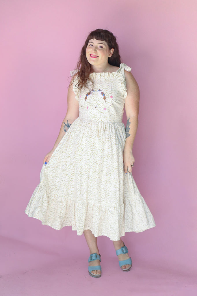 One of a kind Kookaburra dress, made using secondhand cotton! She’s got pockets, she’s got sweet embroidered kookaburra’s and is partly lined with cotton. Zip at back and adjustable tie straps! Ready to ship