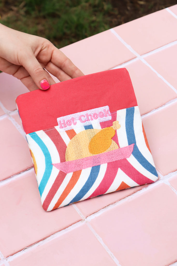 - Hot Chook snack bag, fully insulated and lined with food safe fabric and velcro closure