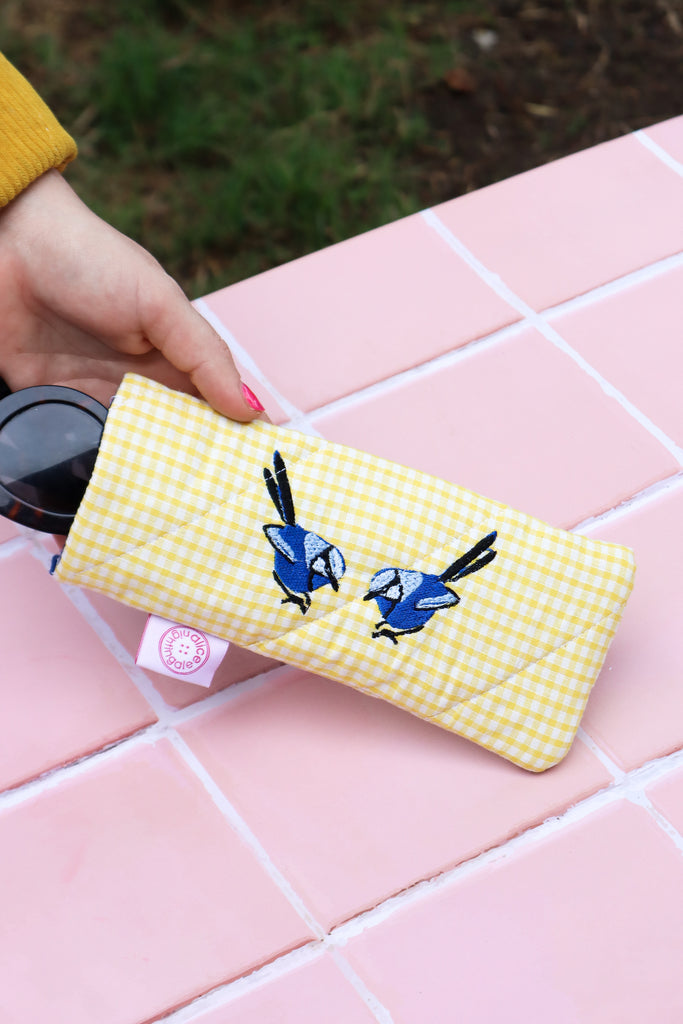 - Yellow gingham Fairy Wren sunglasses case, padded and lined with soft velour
