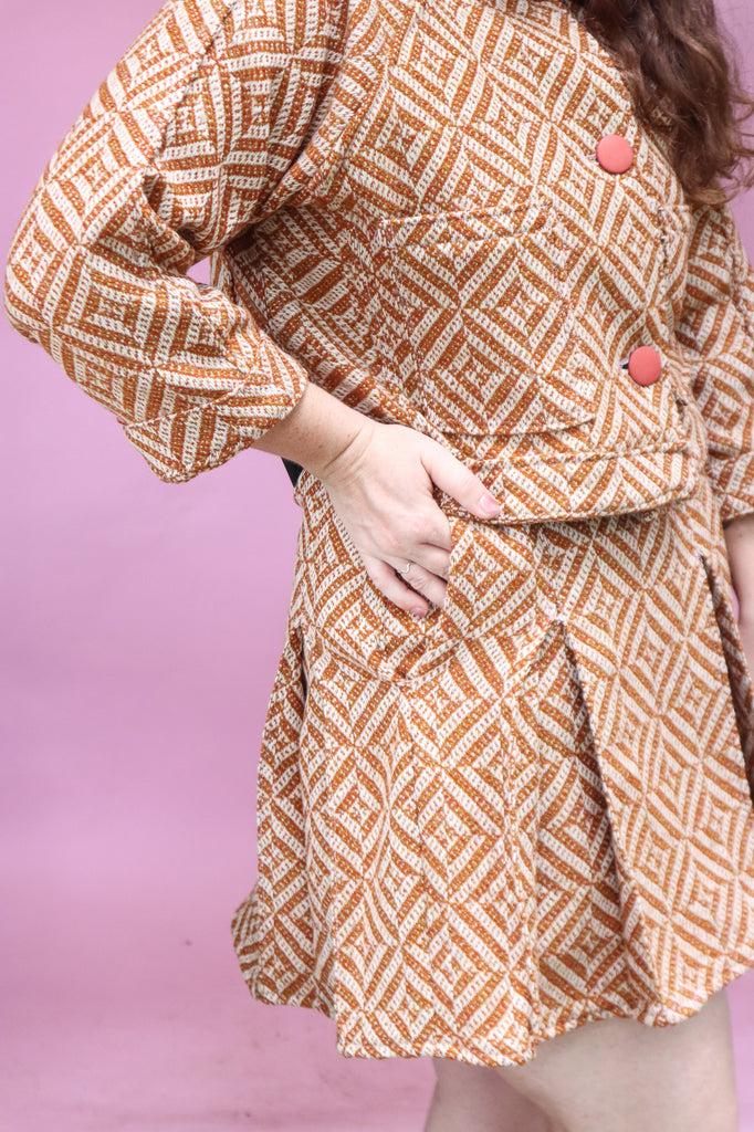 Jacket has lots and lots of top stitching to show off the cute panelling and contrasting band. Pockets on front as well as pockets in skirt. Waistband on skirt is adjustable and runs between a size 12-14 (I’m a 14 and it’s a little snug on my belly)