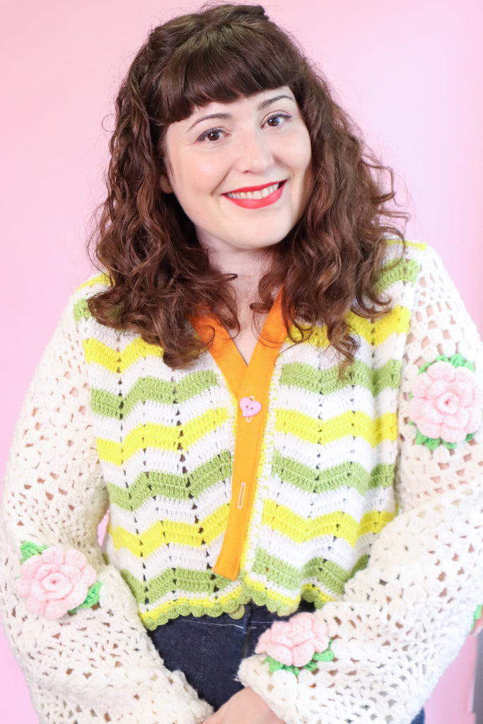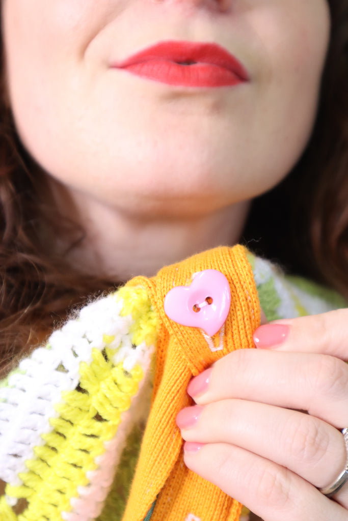 A lovely one of a kind cardi, hand made using secondhand crochet blankets + secondhand trims. Featuring sweet vintage pink heart buttons. Won’t be repeated in this colour combo. Ready to ship