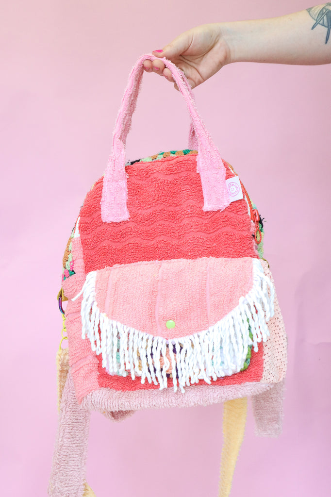 A sweet one of a kind backpack, lovingly made from secondhand fabrics and scraps salvaged from my studio.
