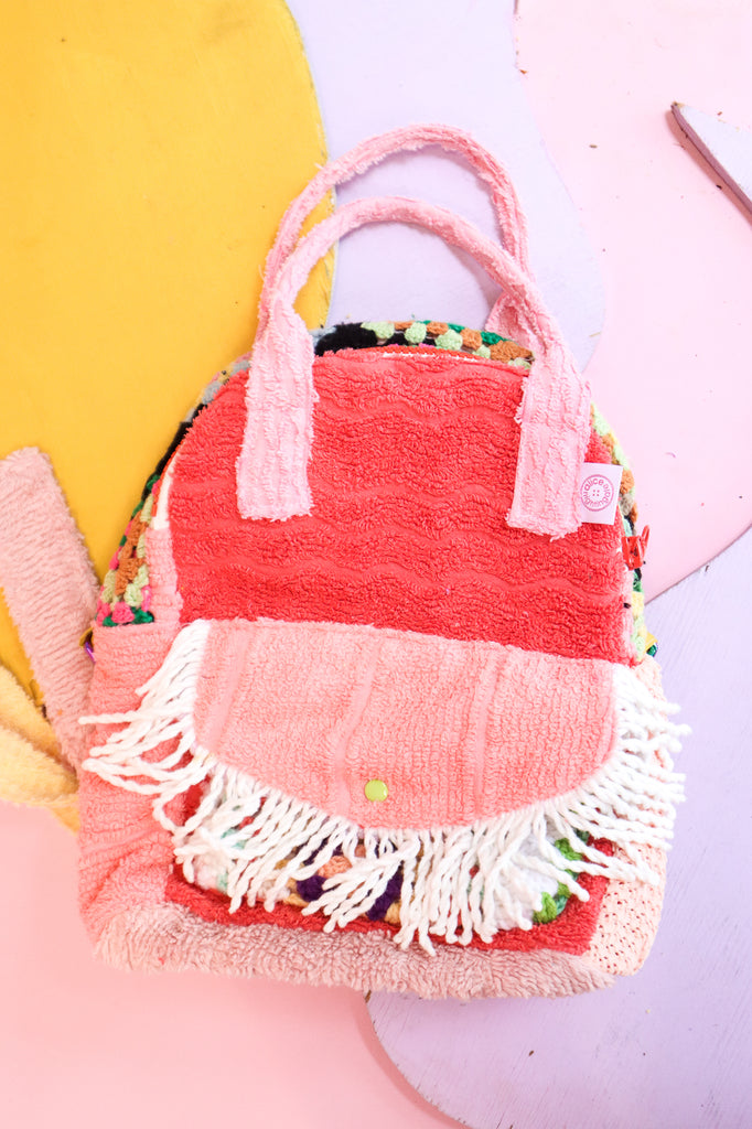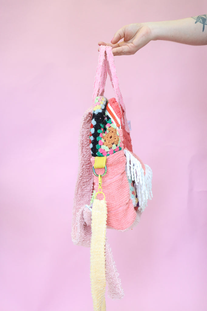 This bag was handmade using scrap chenille from my yeah nah tops, crochet scraps from my cardigans, lining from my dresses, secondhand wadding, zips and buckles.