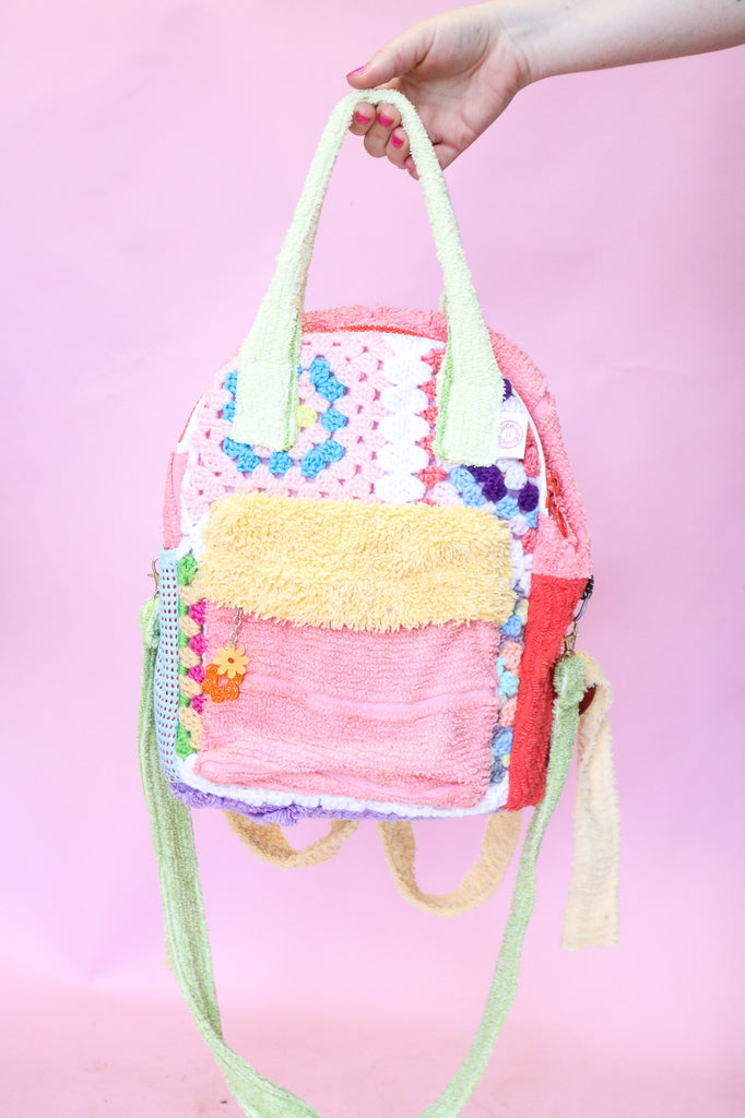 A sweet one of a kind backpack, lovingly made from secondhand fabrics and scraps salvaged from my studio.