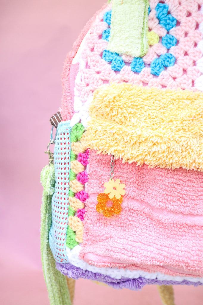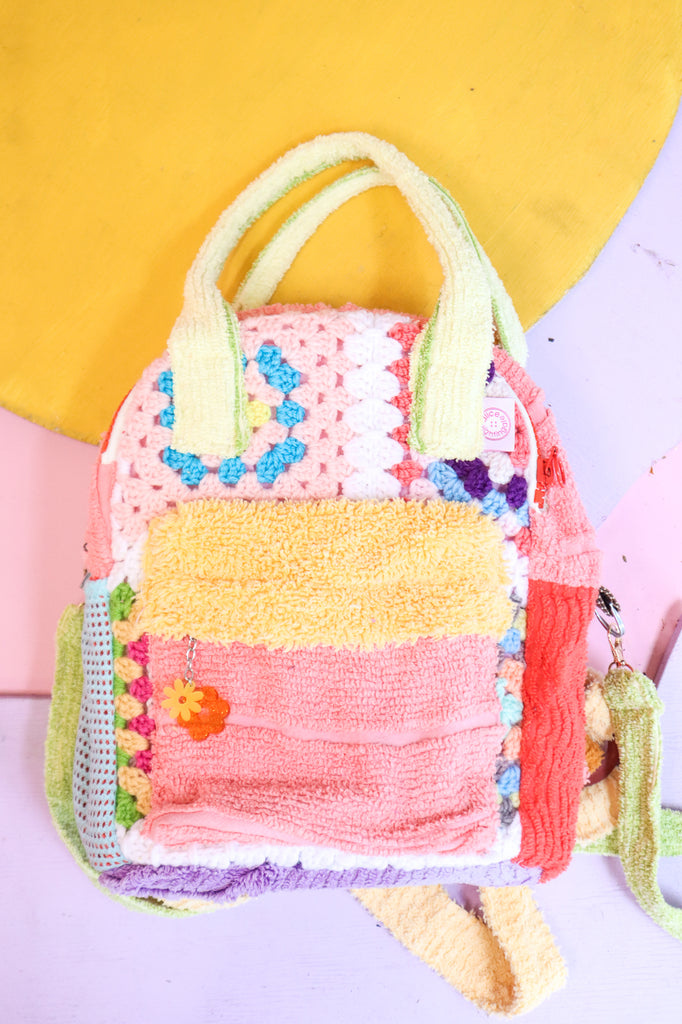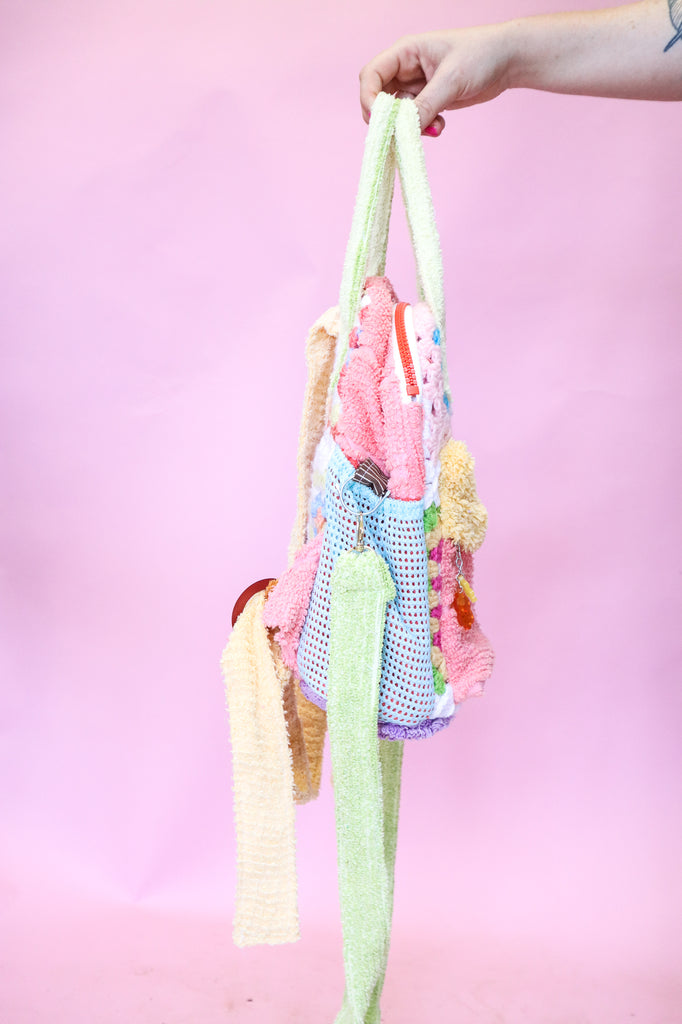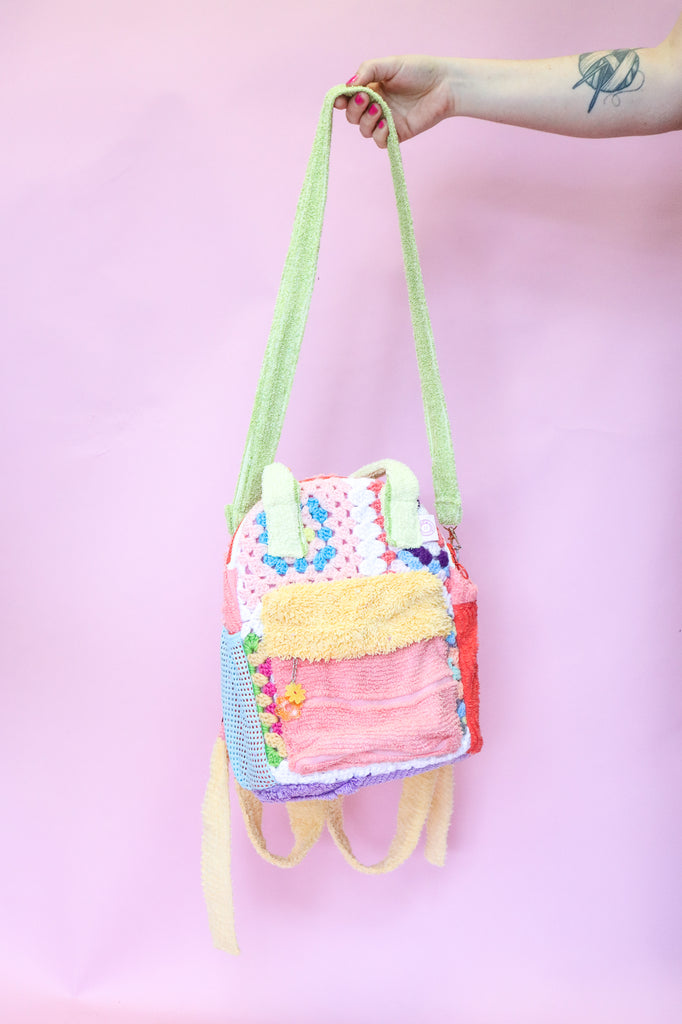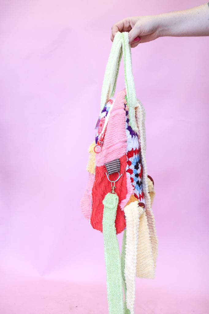 This bag was handmade using scrap chenille from my yeah nah tops, crochet scraps from my cardigans, lining from my dresses, secondhand wadding, zips and buckles.